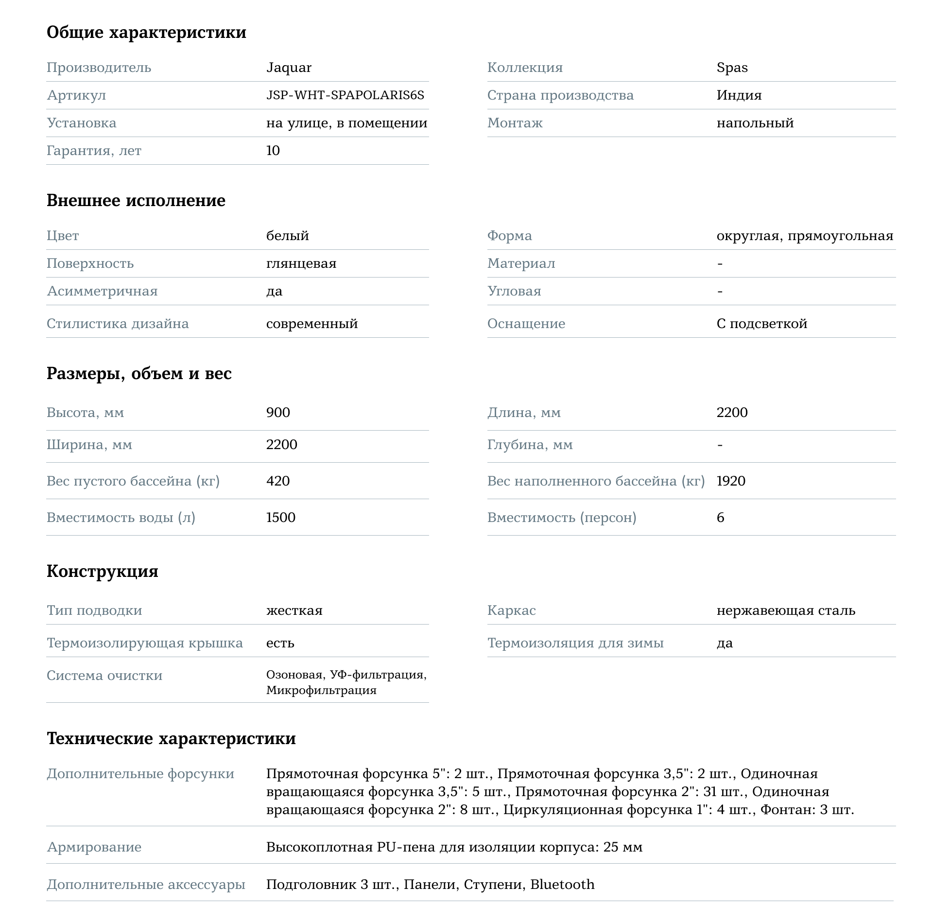 Вес и объем: вес бассейна без воды составляет 420 кг, заполненный вес — 1920 кг. Емкость воды — 1500 литров.