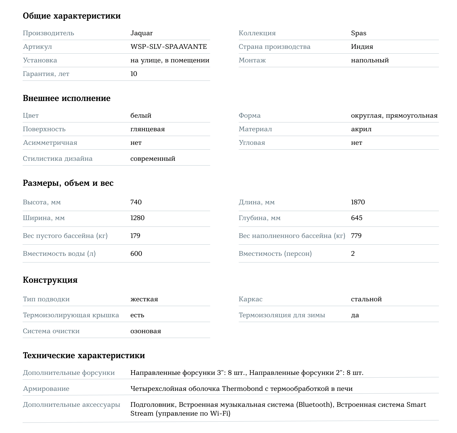 Конструкция бассейна включает прочный деревянный каркас и основу из ABS, что обеспечивает устойчивость и долговечность. Гидромассажная система состоит из направляющих форсунок, создающих мощные потоки для глубокого расслабления. Подводное LED-освещение добавляет атмосферу для вечернего отдыха, а термоизолированные панели способствуют поддержанию тепла воды.