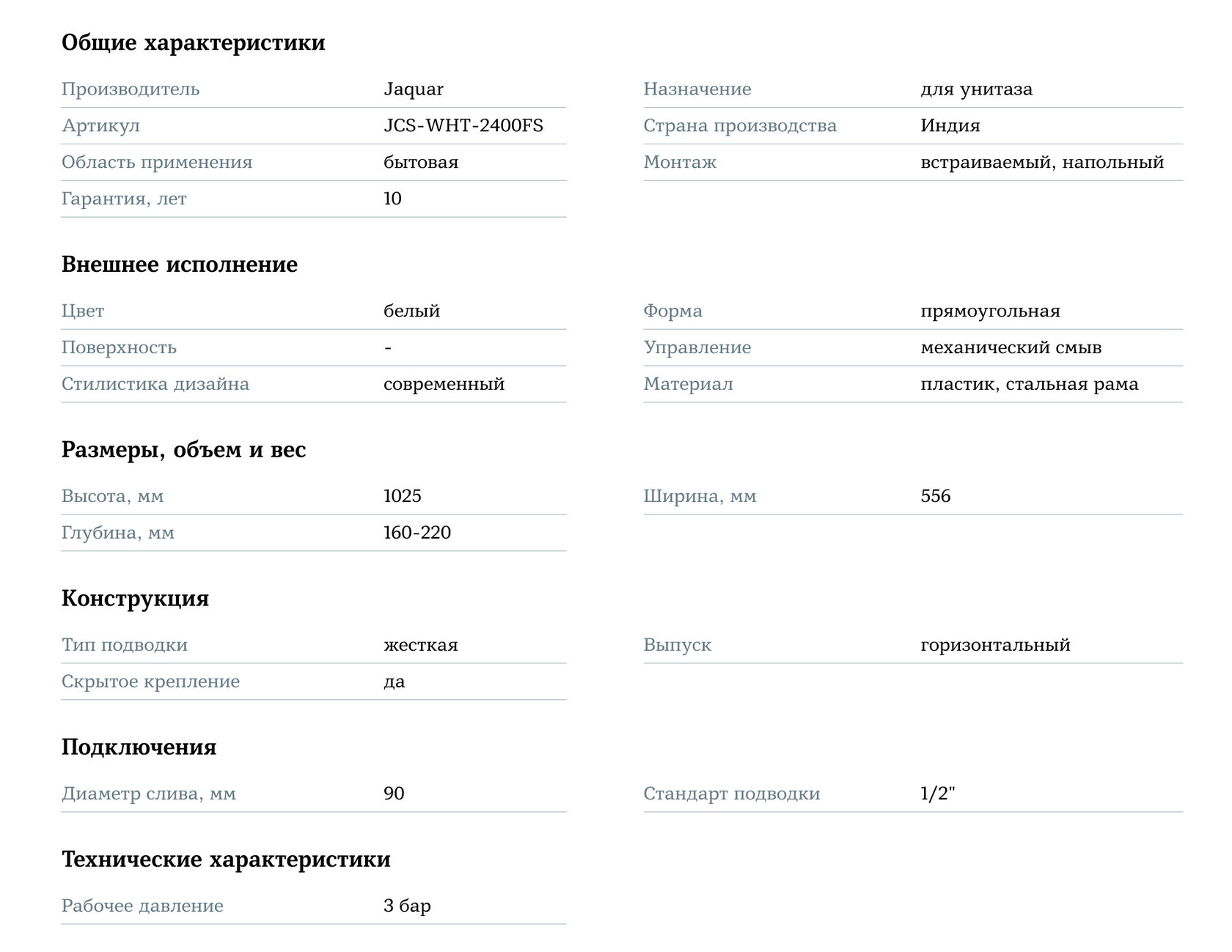 Инсталляция для подвесного унитаза Jaquar JCS-WHT-2400FS — это сочетание надёжности, удобства и современного стиля, которое обеспечит аккуратный внешний вид и комфортное использование вашей ванной комнаты.