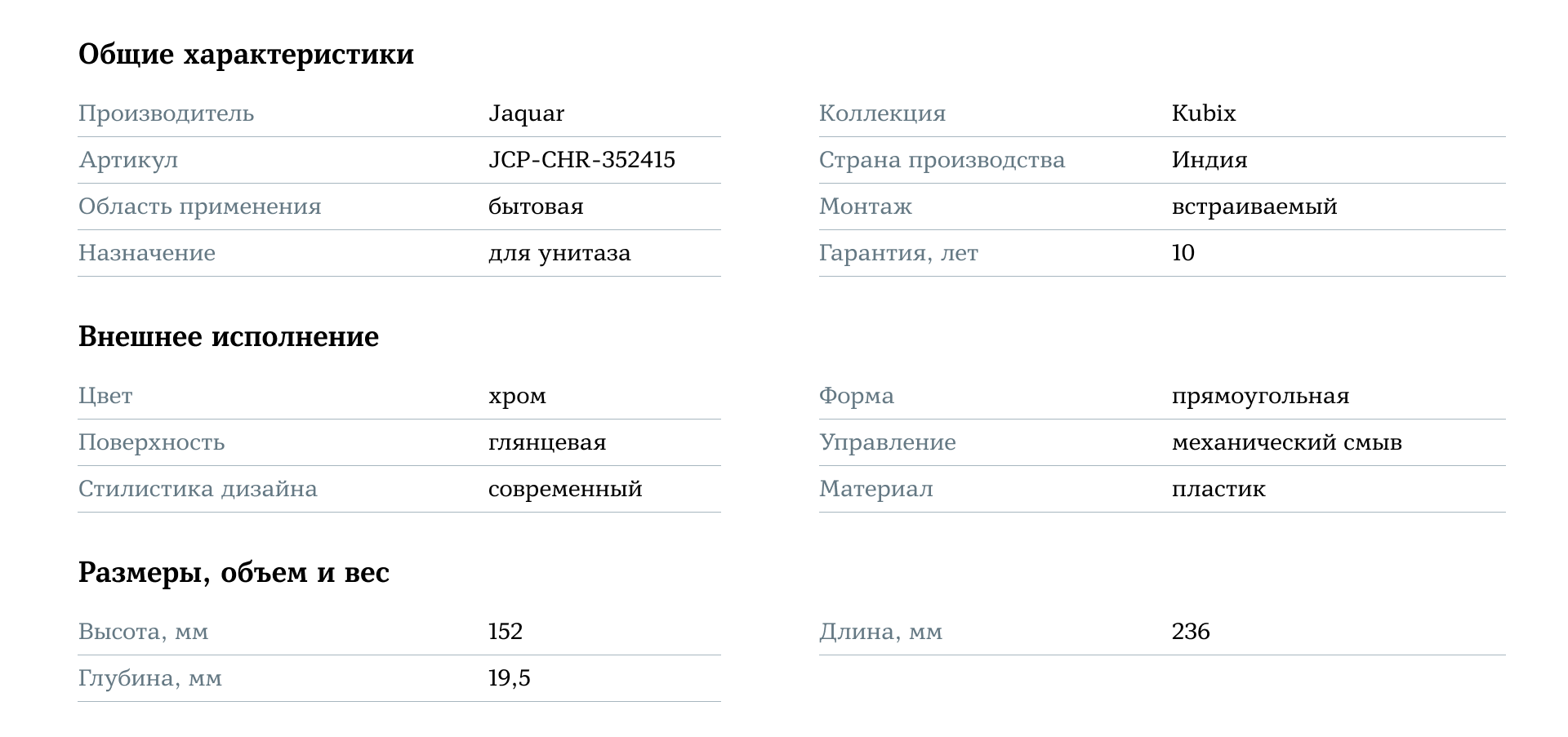 Клавиша смыва Jaquar Kubix JCP-CHR-352415 — это сочетание качества, стиля и функциональности, которое обеспечит комфортное использование и станет элегантным акцентом в вашей ванной комнате.