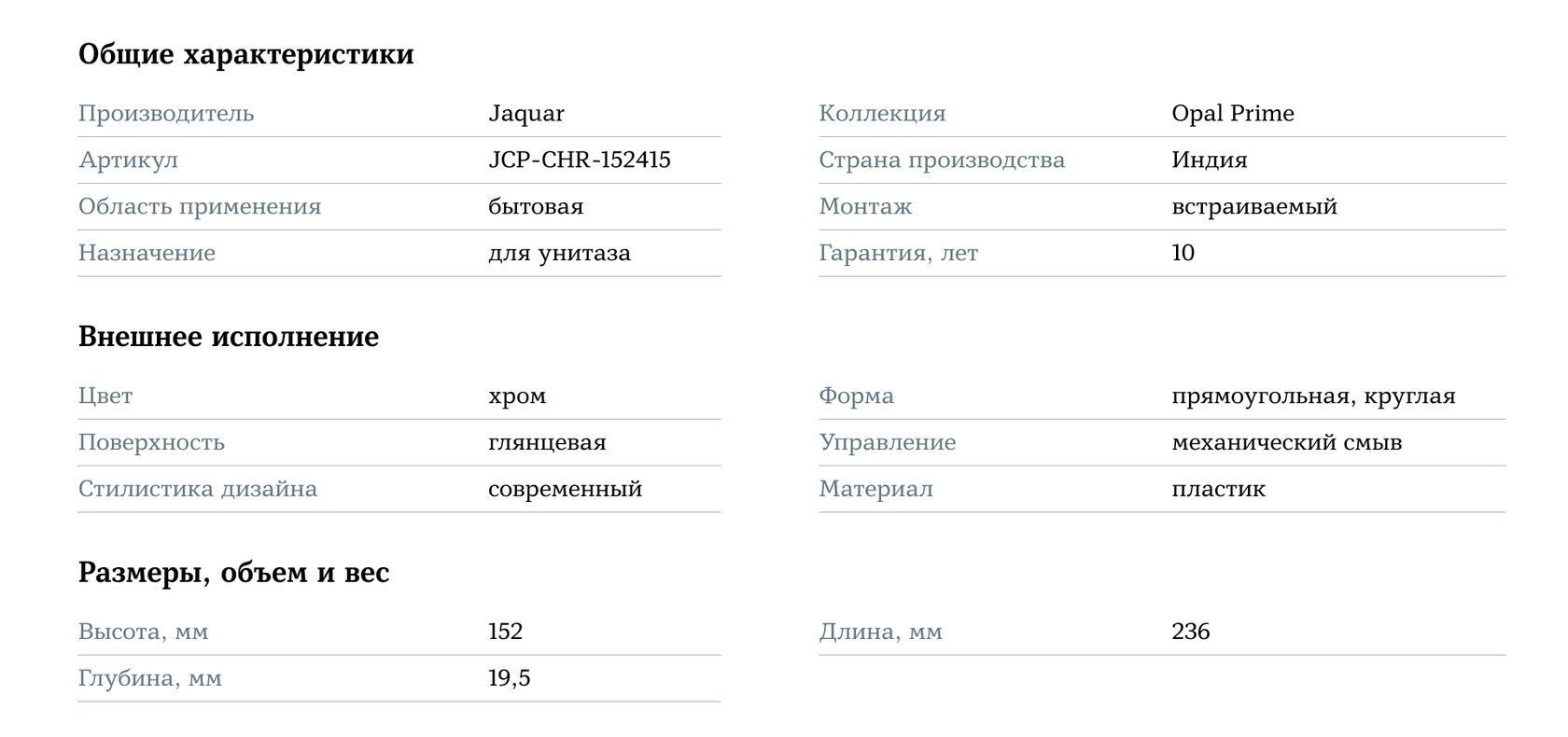 Клавиша смыва Jaquar Opal Prime JCP-CHR-152415 — это сочетание стиля, качества и надёжности, которое обеспечит комфортное использование и станет стильным акцентом вашей ванной комнаты.
