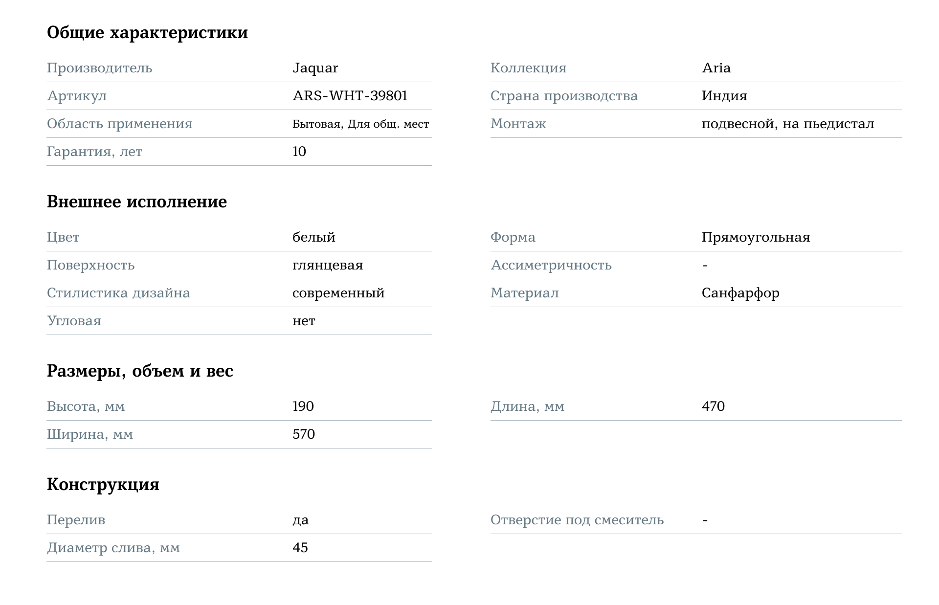 Подвесная раковина Jaquar Aria — это сочетание стиля, комфорта и функциональности, которое придаёт вашей ванной комнате элегантный и аккуратный вид, обеспечивая комфорт и эстетику для ежедневного использования.