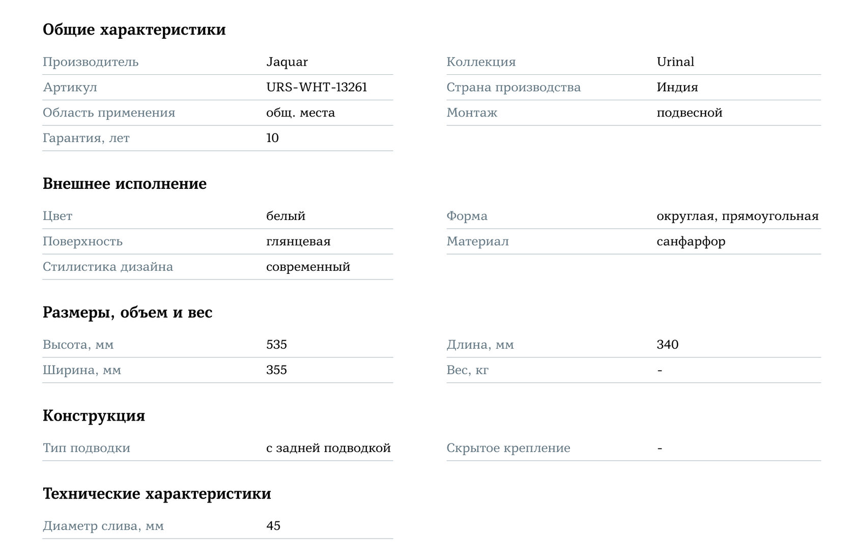 Писсуар Jaquar Urinal URS-WHT-13261 белого цвета — это идеальный выбор для тех, кто ценит стиль, практичность и долговечность. Этот писсуар с элегантным дизайном и высокими эксплуатационными характеристиками станет отличным дополнением для вашего туалетного пространства.