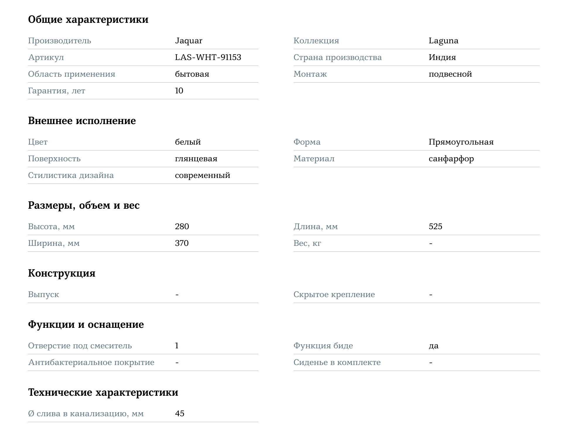 Подвесное биде Jaquar Laguna LAS-WHT-91153 — это сочетание современного дизайна и функциональности, которое добавит вашей ванной комнате элегантности и комфорта, создавая стильное и аккуратное пространство для повседневного использования.