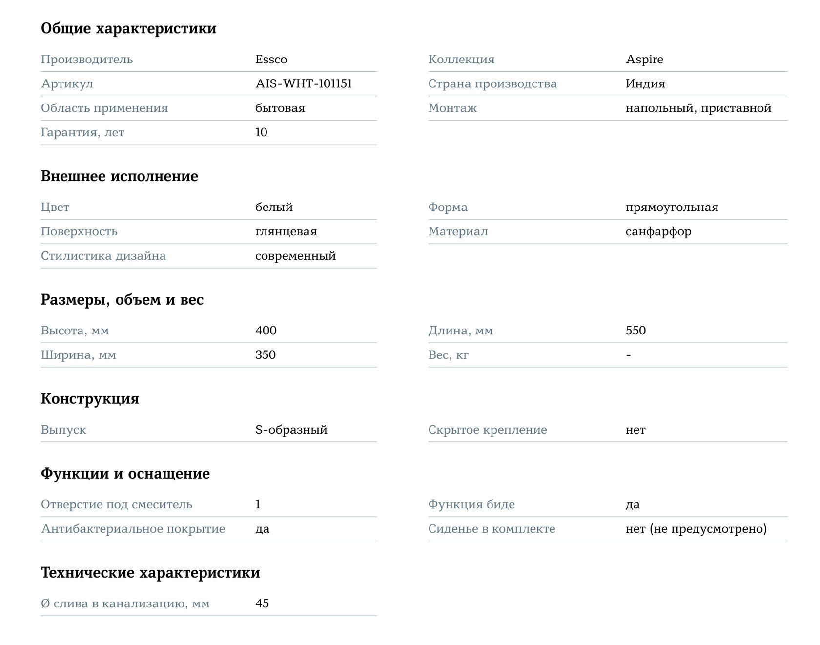 Компактные размеры (350x550x400 мм) позволяют разместить биде даже в небольших санузлах, сохраняя стиль и функциональность. В комплект входят все необходимые крепежные элементы, что облегчает установку и обеспечивает надежность.