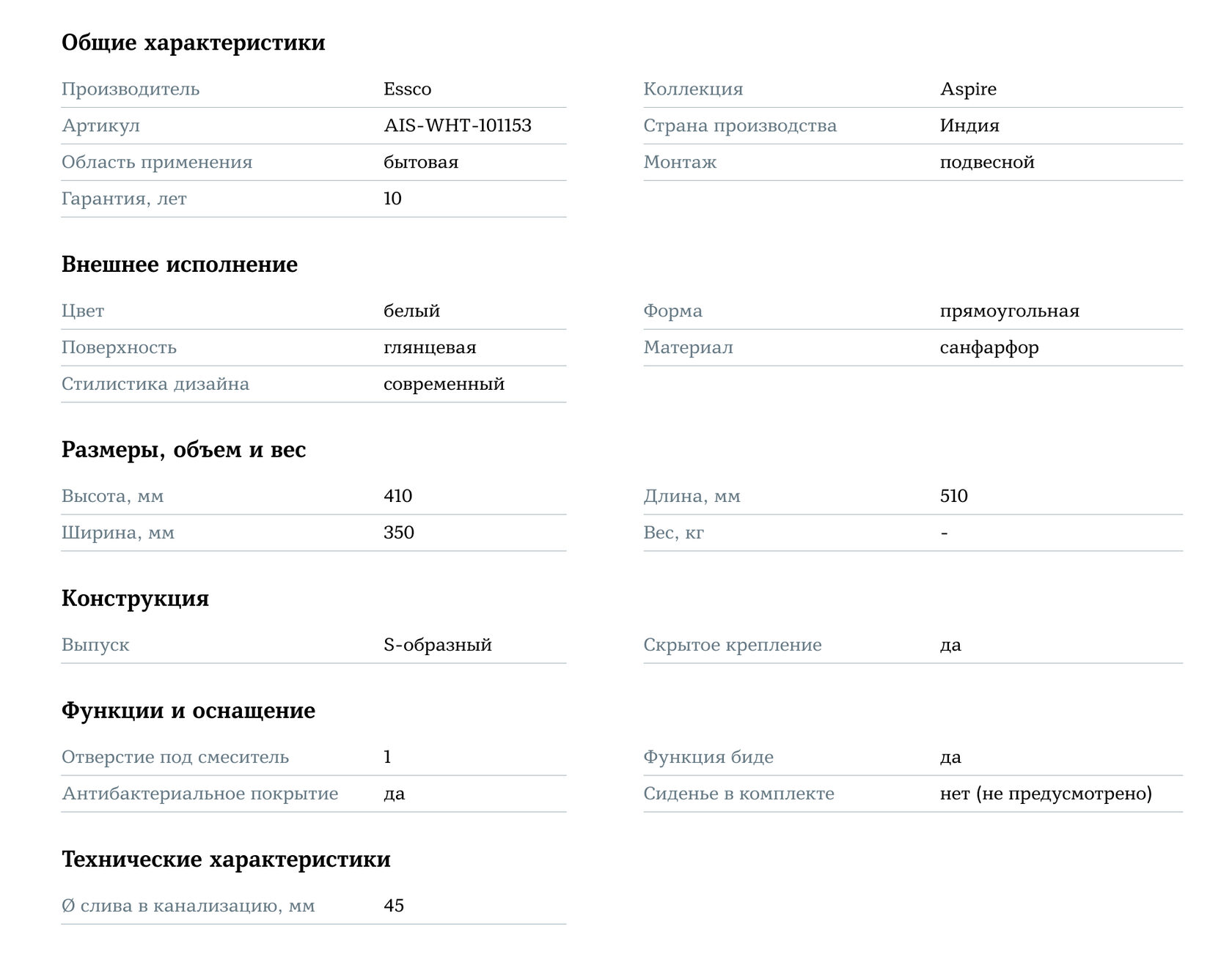 Добавьте современность и гигиеничность в ваш санузел с биде настенным Essco Aspire AIS-WHT-101153, создавая стильное и комфортное пространство!