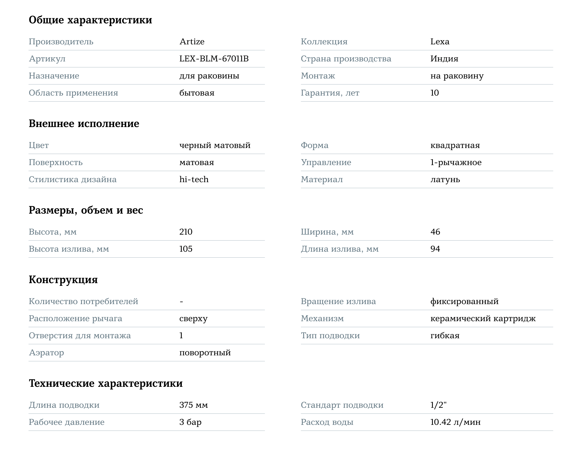 Artize Lexa LEX-BLM-67011B – это идеальный выбор для тех, кто стремится к сочетанию элегантности, функциональности и премиального качества, создавая современное и стильное пространство ванной комнаты.