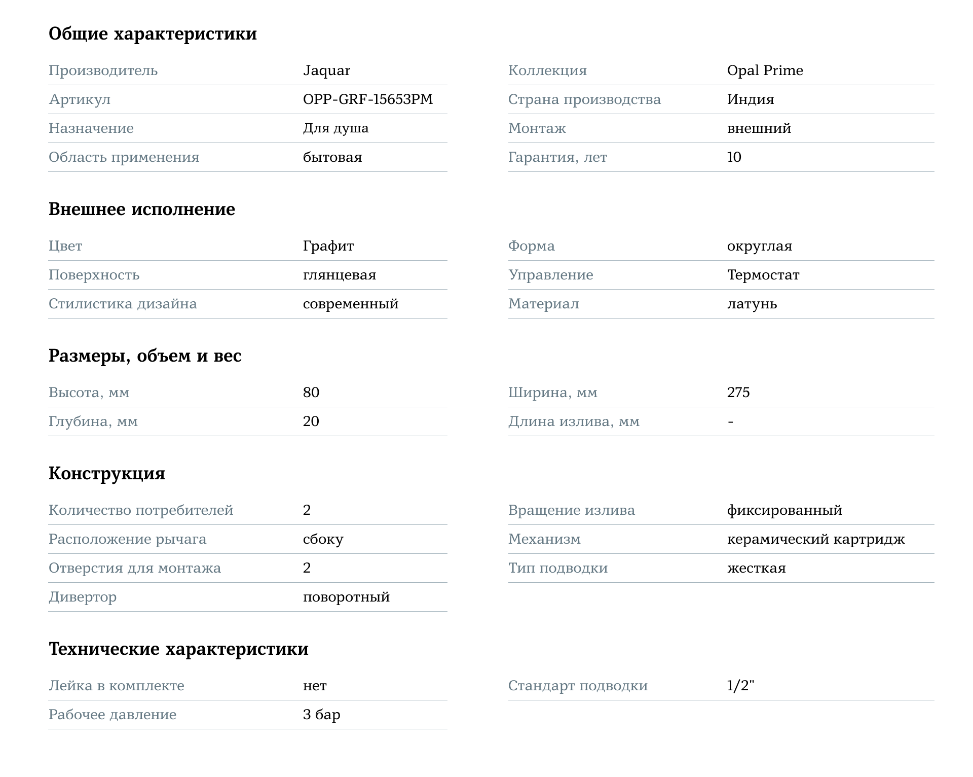 Смеситель для душа Jaquar Opal Prime OPP-GRF-15653PM выполнен в покрытии "графит", что придаёт изделию выразительный и современный вид. Термостатический механизм поддерживает стабильную температуру воды, предотвращая резкие перепады, что делает использование безопасным и удобным для всех членов семьи, особенно для детей и пожилых людей.