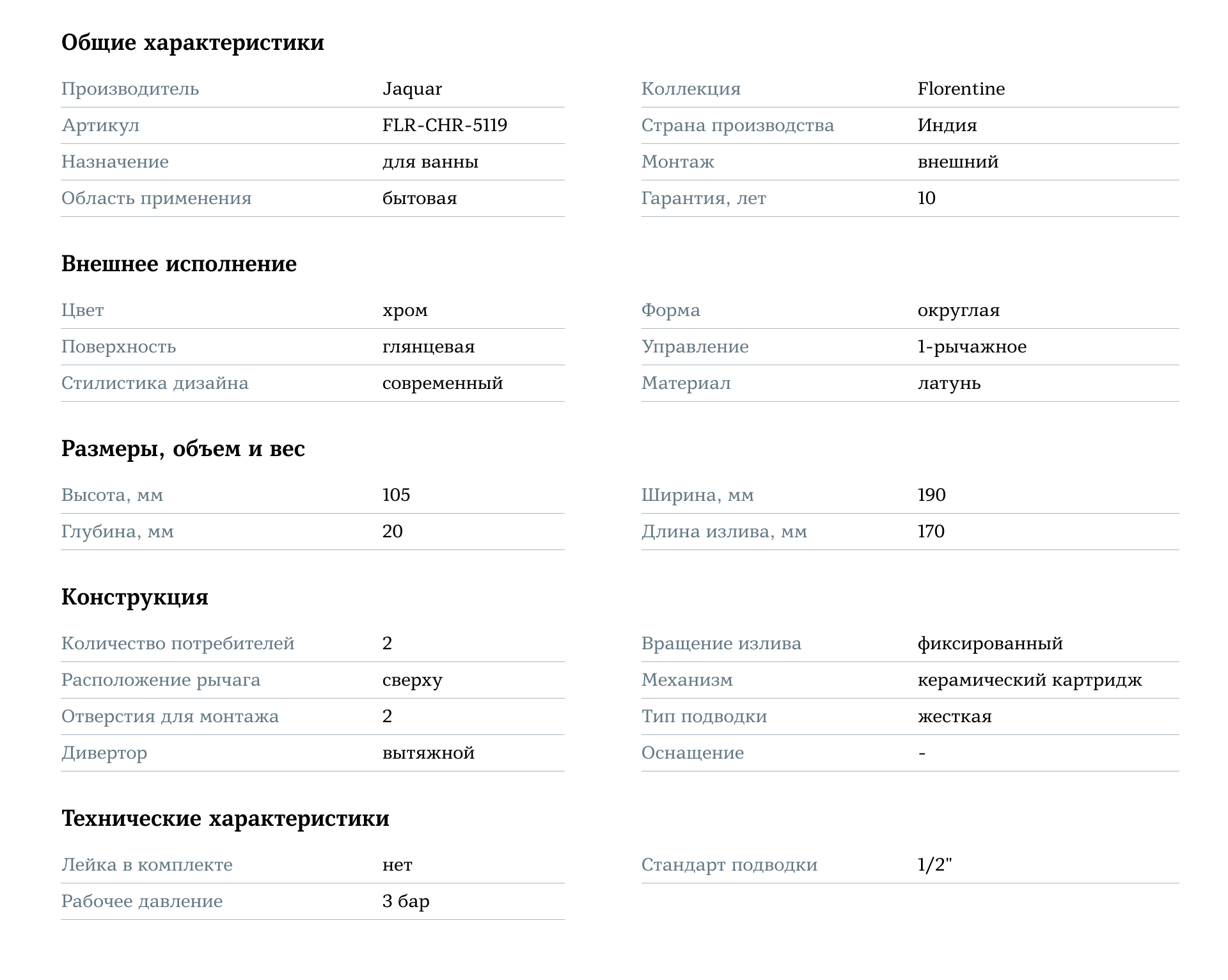 Смеситель для ванны Jaquar Florentine FLR-CHR-5119 — это сочетание качества, функциональности и стильного дизайна, которое станет настоящим украшением вашей ванной комнаты, добавляя удобство и элегантность.