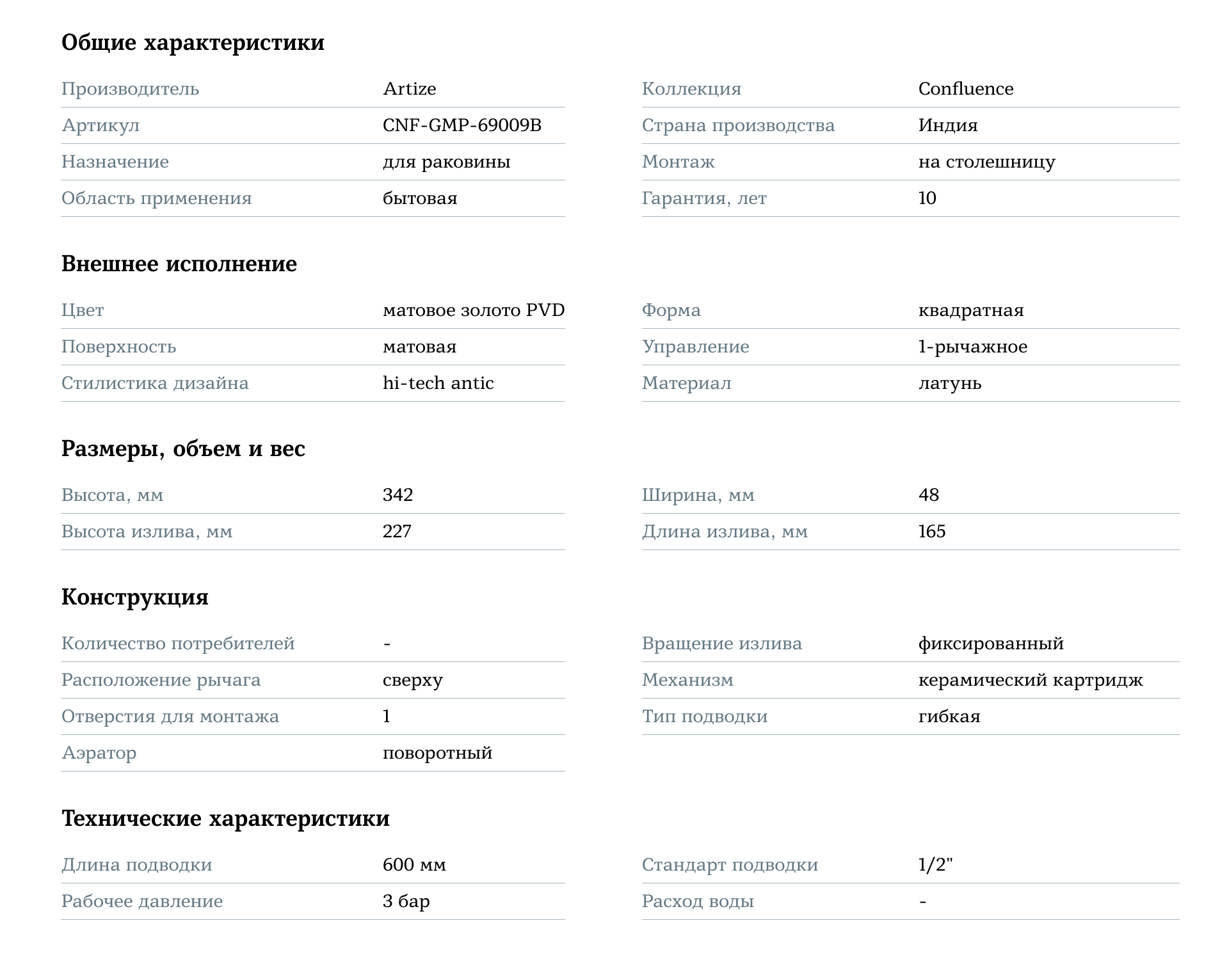 Artize Confluence CNF-GMP-69009B Матовое золото PVD – это идеальный выбор для тех, кто стремится создать в ванной комнате атмосферу роскоши, современного стиля и безупречного комфорта.