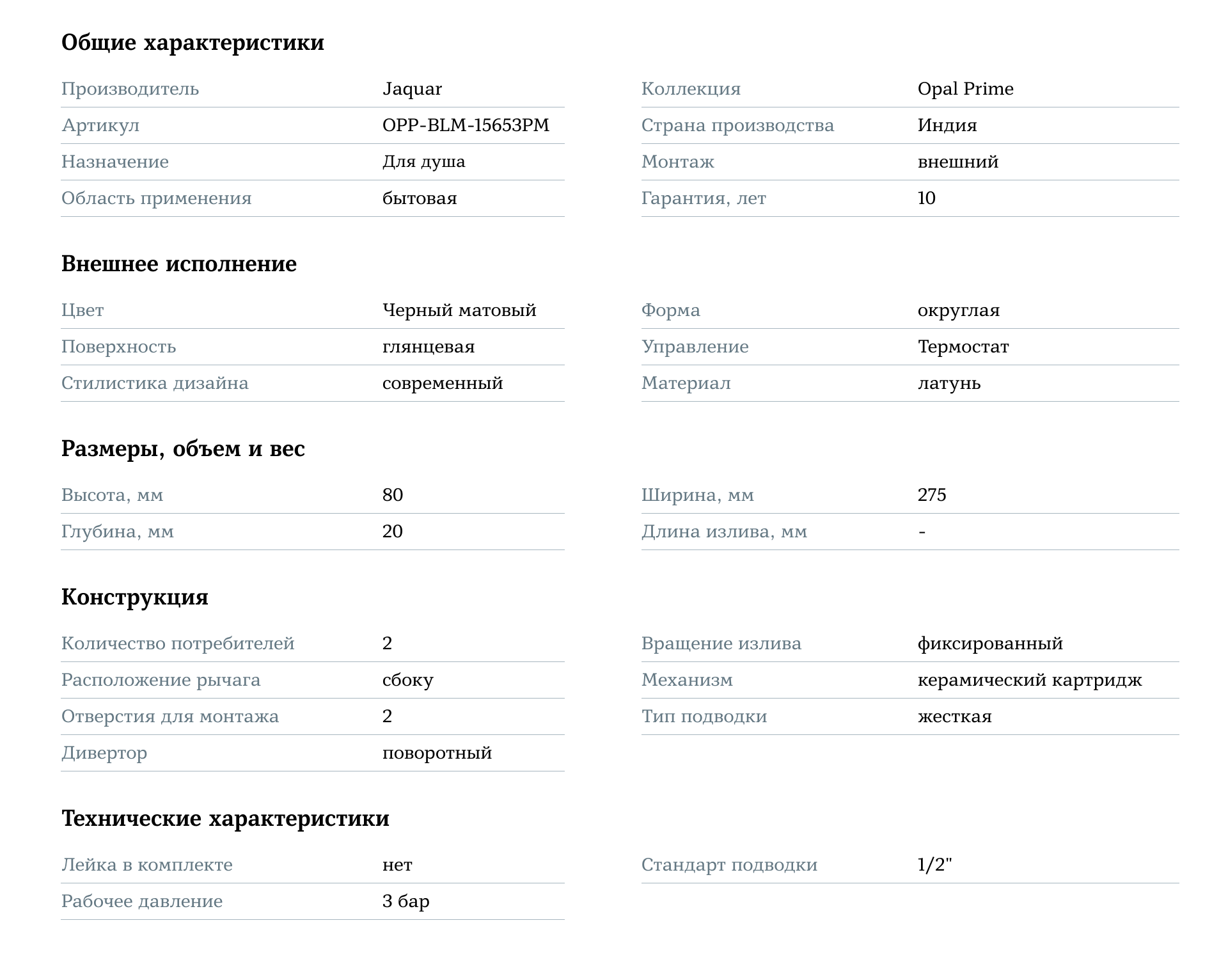 Смеситель для душа Jaquar Opal Prime OPP-BLM-15653PM — это сочетание функциональности, безопасности и стильного дизайна, которое создаст идеальные условия для принятия душа и добавит в вашу ванную комнату атмосферу комфорта и изысканности.