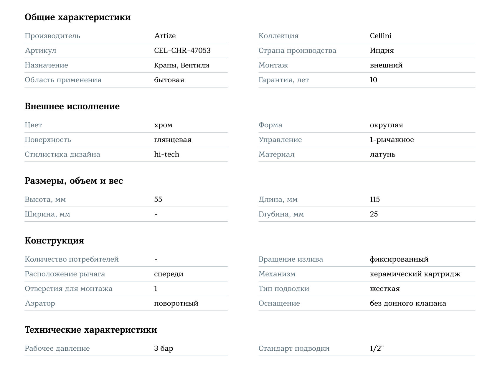 Artize Cellini CEL-CHR-47053 в отделке хром — это идеальный выбор для тех, кто ценит стиль, долговечность и функциональность в сантехнических решениях для своей ванной комнаты или кухни.