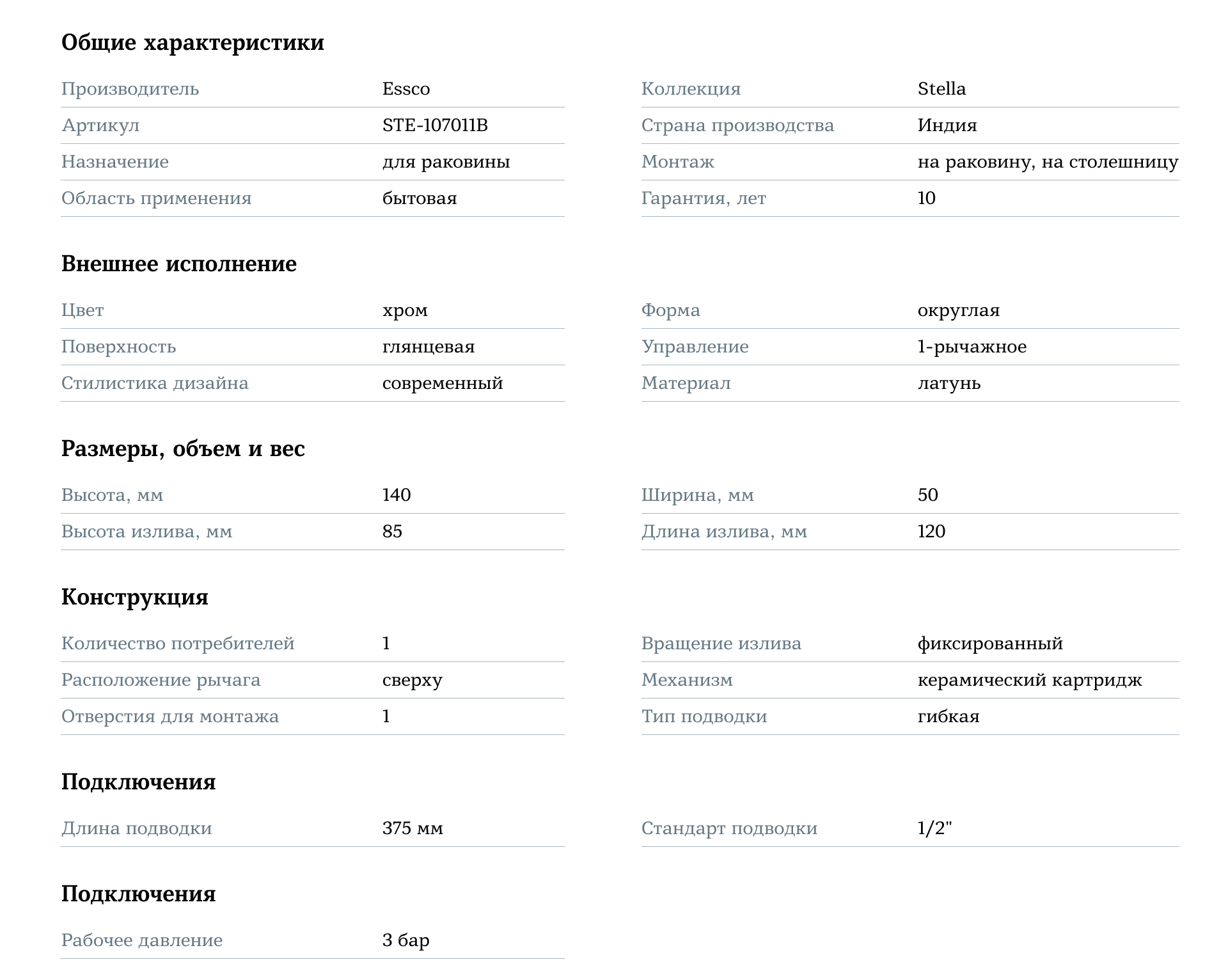 Основные преимущества смесителя Essco Stella STE-107011B:
